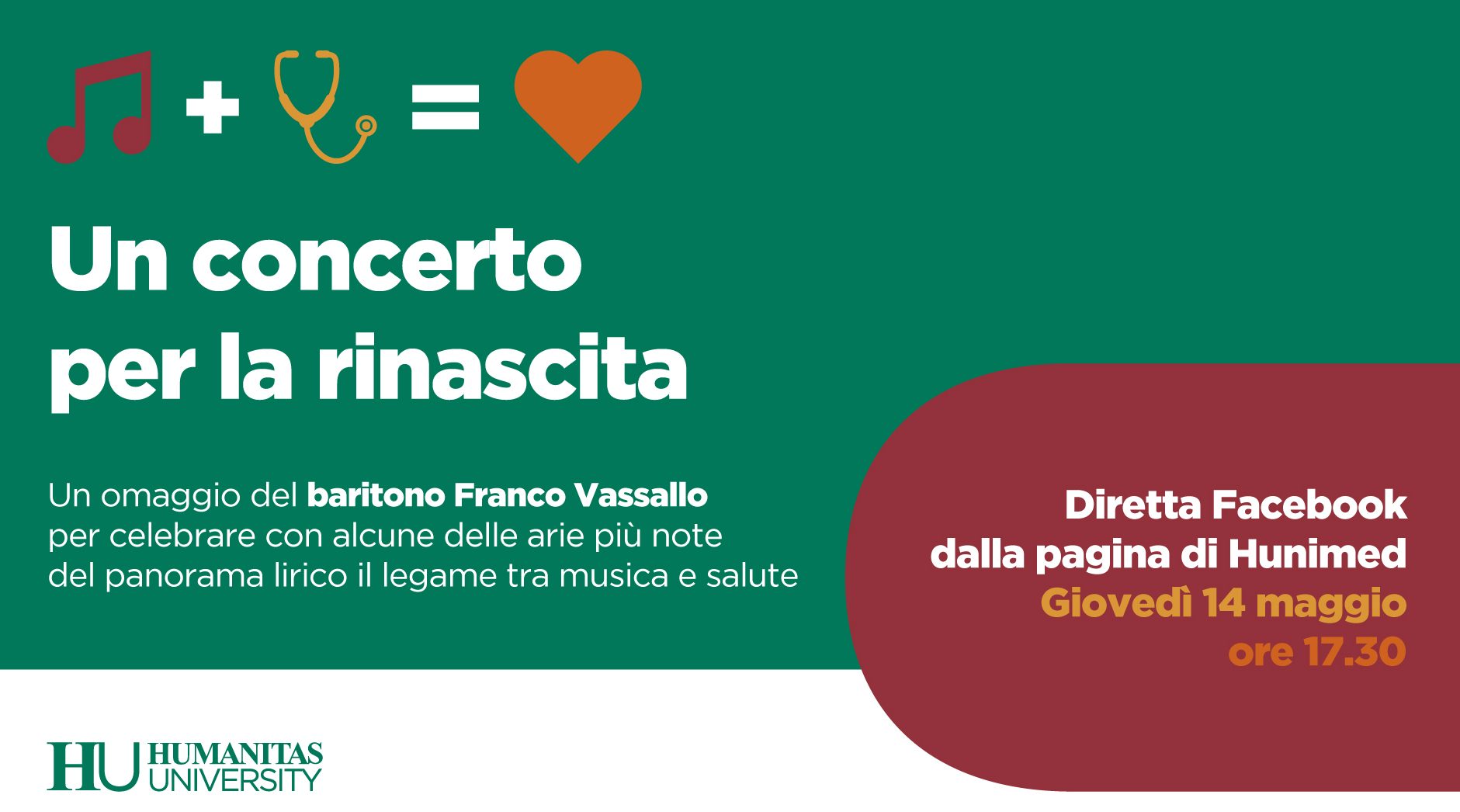 Giovedì 14 maggio, alle ore 17.30, sulla pagina Facebook di Humanitas University vi sarà uno speciale concerto in diretta del noto baritono italiano Franco Vassallo. Un omaggio per celebrare – con alcune delle arie più note del panorama lirico e musicale – il momento della rinascita, ma anche il legame indissolubiletra la musica e la salute.