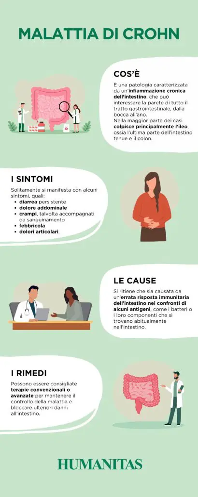 La malattia di Crohn è una malattia infiammatoria cronica intestinale che può colpire la parete di tutto il tratto gastrointestinale. Le cause di questa infiammazione sono solo parzialmente conosciute. L’ipotesi patogenetica prevalente è quella di tipo multifattoriale, implicando una certa predisposizione genetica da parte dell’individuo, una reazione immunologica abnorme da parte dell’intestino nei confronti di determinati antigeni, e fattori ambientali ancora poco noti. È caratterizzata dalla presenza di ulcere intestinali, alternate a tratti di intestino sano, e, se non curata adeguatamente, può portare a complicanze quali stenosi e/o fistole, che possono richiedere un intervento chirurgico. I sintomi di esordio o nelle riacutizzazione di malattia possono variare dal dolore addominale, alla diarrea cronica, alla perdita di peso o alla febbricola persistente. La malattia di Crohn può anche interessare la regione peri-anale con fistole o ascessi. La terapia immunomodulante e il monitoraggio regolare permettono di controllare la malattia e la sua progressione nella maggior parte dei casi.